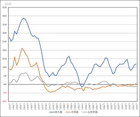 1985年のプラザ合意以降バブル経済が起こり、ふたたび東京大都市圏への人口流入が始まる。高度経済成長期には三大都市圏のいずれも転入超過であったが、この時期から東京圏だけが大幅な転入超過となる、いわゆる「東京一極集中」現象が始まるのが特徴である【図表3】。一方、中心都市ではバブル経済による地価高騰で人口が減少して「郊外化(タイプ4)」に移行し、この傾向は1990年代前半まで続く。