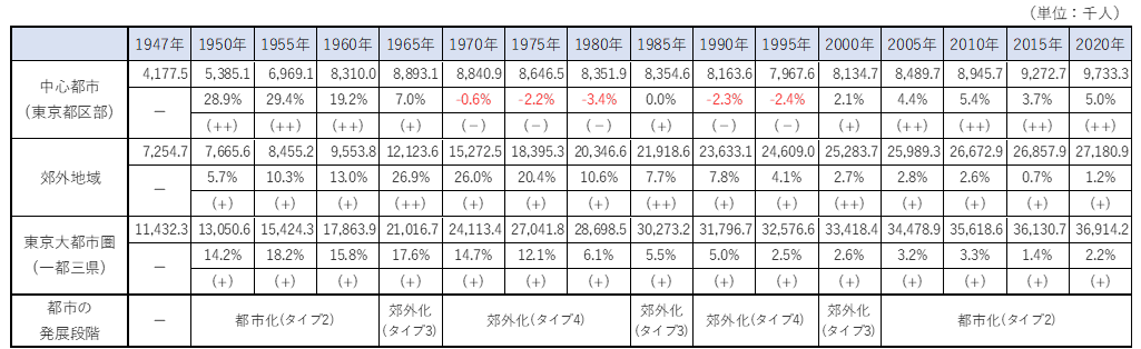 このクラッセンの都市発展段階仮説を用いて、東京大都市圏の発展段階の状況を検証する。ここでは簡易的に、東京大都市圏の範囲を東京圏エリア(東京都・埼玉県・千葉県・神奈川県)と同じと仮定し、中心都市は東京都区部(23区)、郊外地域は東京都区部を除く一都三県とする【図表2】。